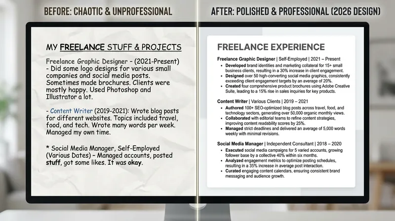 For career changers, freelance projects are your secret weapon. They provide tangible proof of your skills in a new field, even if your formal job titles are in another industry. The key is to strategically select and describe projects that align with your new career goals.